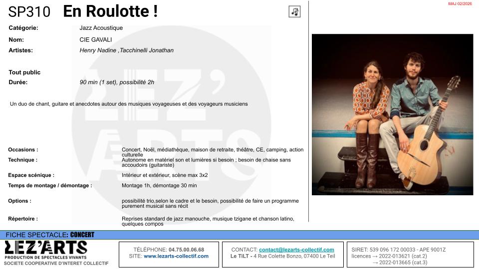 Technique : si besoin, le duo est autonome en matériel son pour un concert acoustique amplifié.