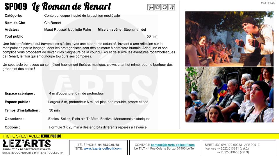 Dynamique et comique, LE ROMAN DE RENART est un spectacle où se mêlent habilement théâtre, musique, chant et mime pour le bonheur des petits et des grands. C’est sans doute pour cela que ce spectacle rencontre un vif succès depuis plusieurs plus de 10 ans.
